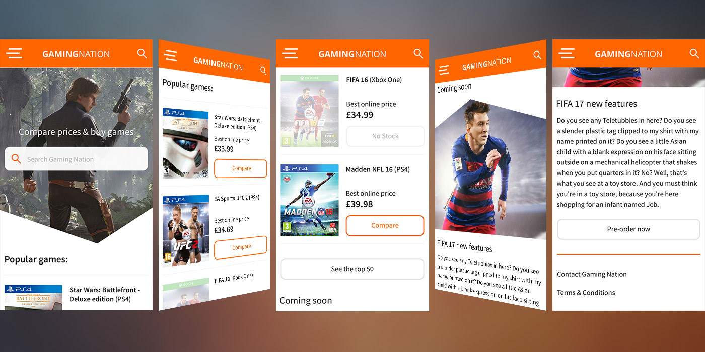 As the sole UI and UX designer for Gaming nation I was responsible for generating the journey and style, as well as ensuring the site was clear and concise for users. I also generated a style guide for our sole developer to use in order to ensure that all pages across the site are consistent as possible.